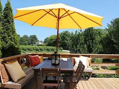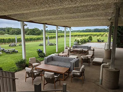 A beautifully renovated residential house is the centerpiece of this sophisticated winery, creating a truly cozy and elegant wine-tasting experience. Multiple seating areas, situated in different rooms of the house, create an intimate space for enjoying exceptional wines – unlike the massive, bustling buildings you find at other North Fork wineries. The cozy feel continues outside, where the outdoor seating areas are surrounded by lush foliage and trees (which provide refreshing shade during the hot summer months).